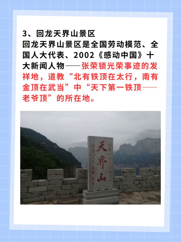 回龙天界山景区是全国劳动模范、全国人大代表、2002《感动中国》十大新闻人物——张荣锁光荣事迹的发祥地,道教“北有铁顶在太行,南有金顶在武当”中“天下第一铁顶——老爷顶”的所在地。