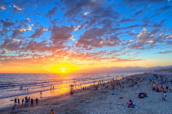 这是洛杉矶最受欢迎的海滩之一,拥有绵延数英里的黄色沙滩和蔚蓝的海水。您可以在海滩上晒太阳,冲浪,或者在附近的圣塔莫尼卡长廊上漫步,品尝海鲜美食或购物。