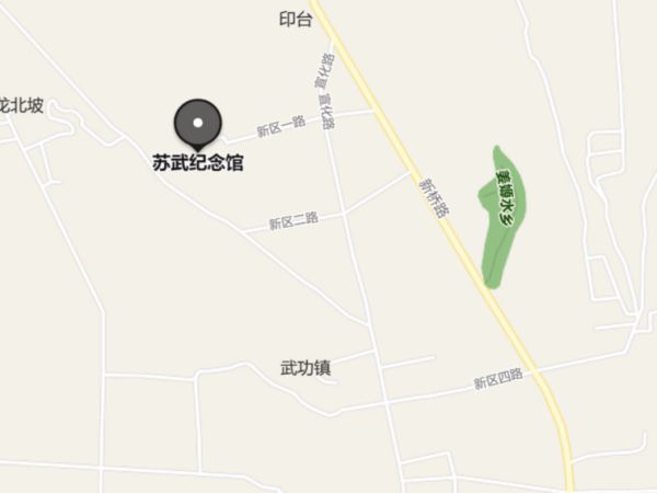 东临漆水,西依凤岗。苏武墓穴东向,背附青山,漆水河自墓前蜿蜒而过,依山傍水,环境优美,为“武功八景”之一。该纪念馆占地面积7000平方米,建筑面积580平方米,其主要建筑依次为仿汉阙门、苏武牧羊铜像、南北陪殿、苏武大殿、南北祭亭、苏武墓祭台、墓冢。