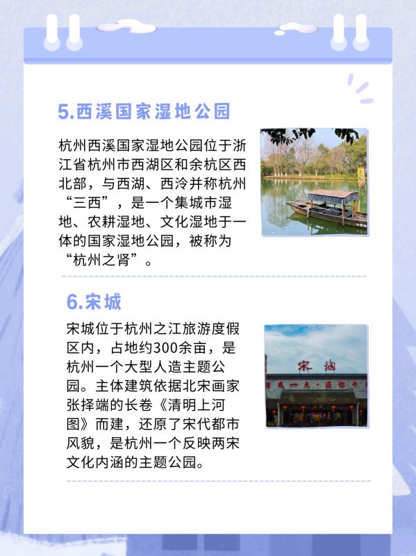 5.杭州西溪国家湿地公园:位于浙江省杭州市西湖区和余杭区西北部,与西湖、西泠并称杭州“三西”