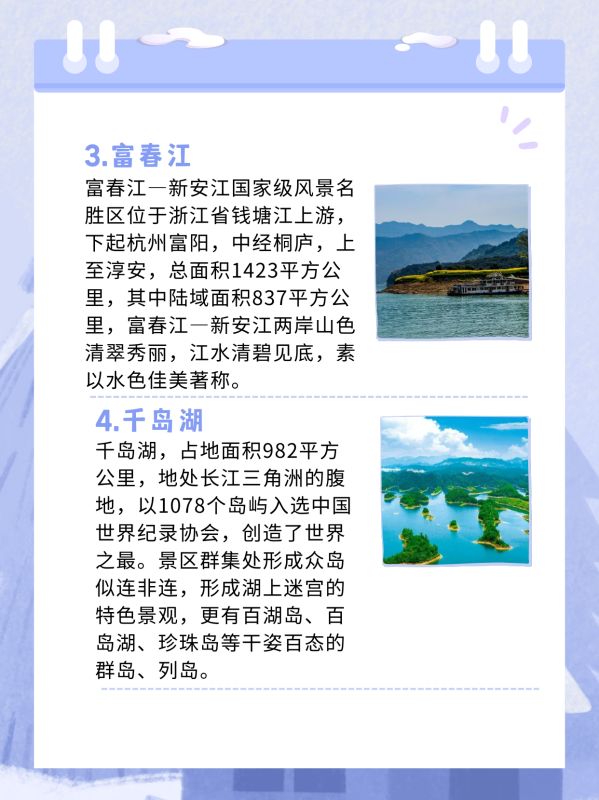 3.富春江—新安江国家级风景名胜区:位于浙江省钱塘江上游,下起杭州富阳,中经桐庐,上至淳安