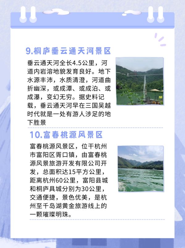 10.富春桃源风景区:位干杭州市富阳区胥口镇,由富春桃源风景旅游开发有限公司开发,总面积达15平方公里,距离杭州60公里