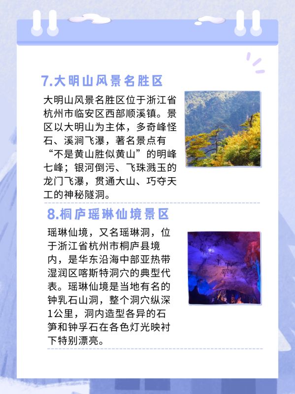 7.大明山风景名胜区:位于浙江省杭州市临安区西部顺溪镇。景区以大明山为主体,多奇峰怪石、溪涧飞瀑,共有32峰、13涧、8瀑。