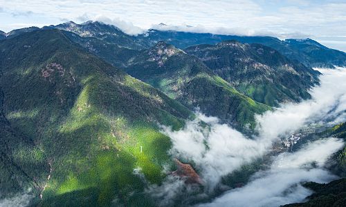 四周层峦叠嶂、绿岭逶迤,古木参天、枯藤倒挂、鸟语花香,原始森林遮天闭日。