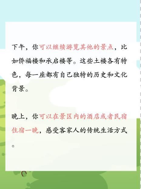 早晨是一天中气温较低、景点较少拥挤的时候,是进行一日游的最佳时机。您可以选择在福州、厦门或泉州等福建省内的城市出发,前往永定。以下是一天游的主要行程:
