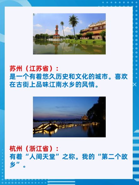 杭州(浙江省):杭州是一个美丽的城市,有着“人间天堂”之称。在这里,您可以游览西湖、灵隐寺等著名景点,也可以品尝到地道的杭州美食。