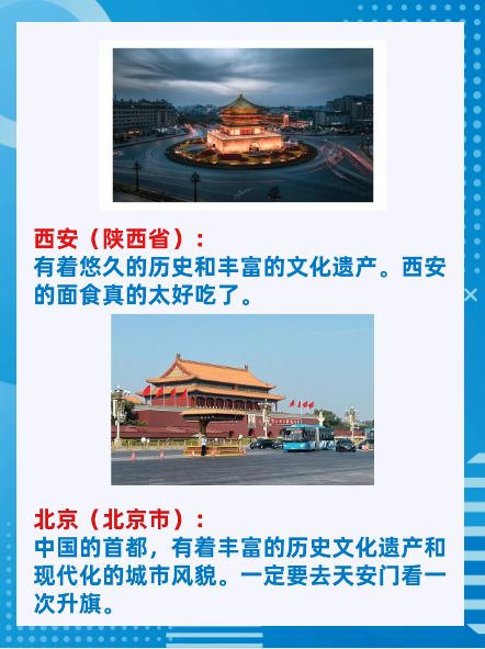 北京(北京市):北京是中国的首都,有着丰富的历史文化遗产和现代化的城市风貌。在这里,您可以游览故宫、长城等著名景点,也可以在现代化的购物中心享受购物的乐趣。