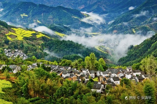 与婺源不同,石潭的村庄层次丰富,错落有致,是更加立体的春之图。云雾缭绕间、房屋错落中,尽是盛放的油菜花、梨花。