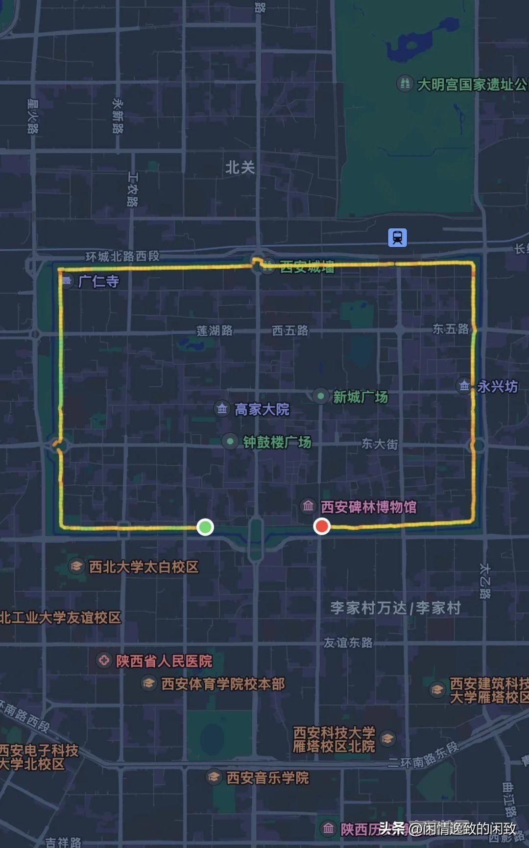 从19点太阳还未完全下山开始骑,沿着城墙上磕磕巴巴的墙砖路面,颠颠簸簸的,骑行路过了西门、北门、东门,四大角楼,俯视了广仁寺、火车站、永兴坊、碑林,看了夕阳西下,看了远处的秦岭山脉,回到南门东侧的时候,正好20点20分,花了不到一个半小时的时间,完成了这段12.85公里的骑行。