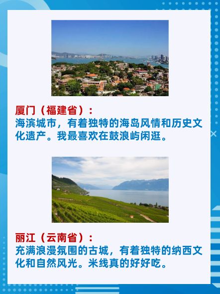 厦门(福建省):厦门是一个美丽的海滨城市,有着独特的海岛风情和历史文化遗产。在这里,您可以游览鼓浪屿、厦门大学、南普陀寺等著名景点,也可以在海边享受浪漫的时光。