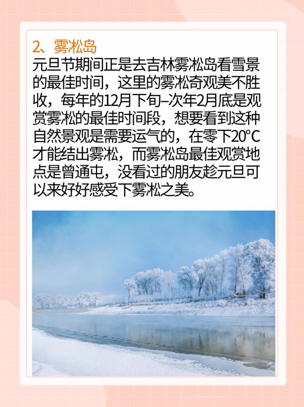 元旦期间正是观赏吉林雾凇岛雪景的最佳时间,雾凇奇观美不胜收。曾通屯是最佳观赏地点,可以感受大自然的神奇和美丽。