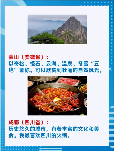 成都(四川省):成都是一个历史悠久的城市,有着丰富的文化和美食。在这里,您可以游览宽窄巷子、锦里古街等著名景点,也可以品尝到正宗的川菜和火锅。
