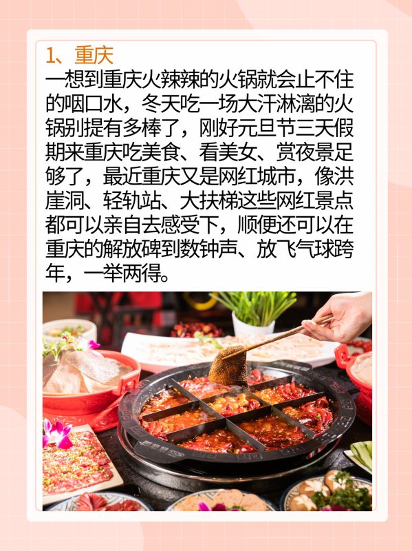 重庆火辣火锅、洪崖洞、轻轨站等网红景点不容错过。元旦节三天假期正好可以来重庆品尝美食、看美女、赏夜景,感受城市的活力和魅力。