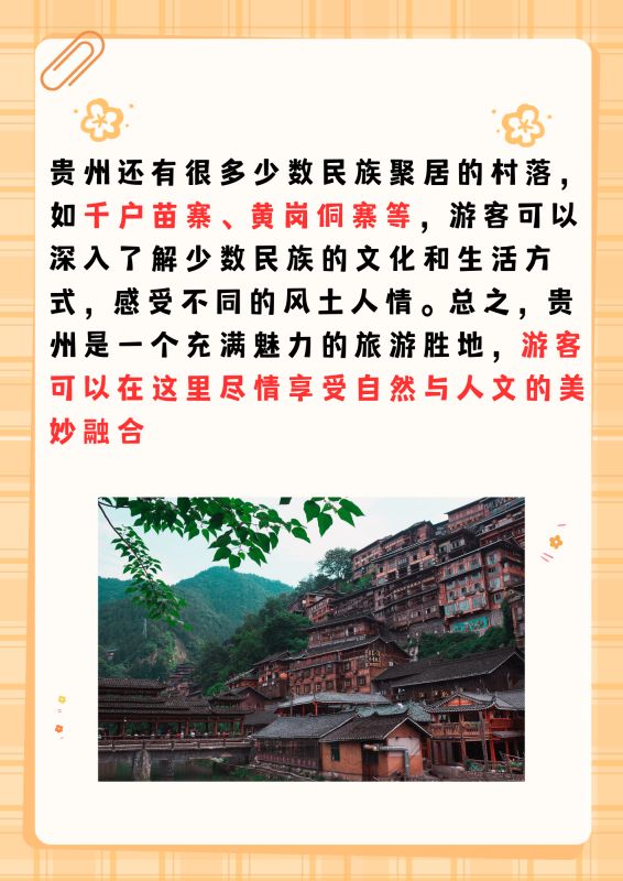 贵州还有很多少数民族聚居的村落,如千户苗寨、黄岗侗寨等,游客可以深入了解少数民族的文化和生活方式,感受不同的风土人情。总之,贵州是一个充满魅力的旅游胜地,游客可以在这里尽情享受自然与人文的美妙融合