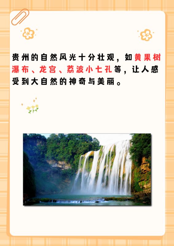 贵州的自然风光十分壮观,如黄果树瀑布、龙宫、荔波小七孔等,让人感受到大自然的神奇与美丽。