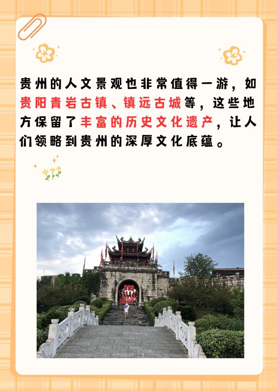 贵州的人文景观也非常值得一游,如贵阳青岩古镇、镇远古城等,这些地方保留了丰富的历史文化遗产,让人们领略到贵州的深厚文化底蕴