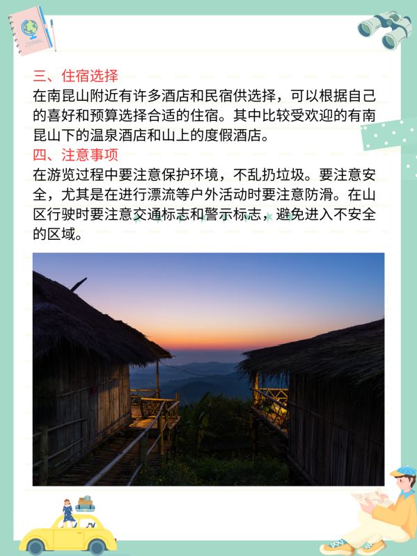 5. 注意事项:在游览南昆山时,请注意保护环境,不乱扔垃圾。由于山区气温较低,建议穿着舒适的衣物和鞋子,以应对可能的气候变化。此外,如果您有身体不适或患有高原反应等问题,请及时就医。
