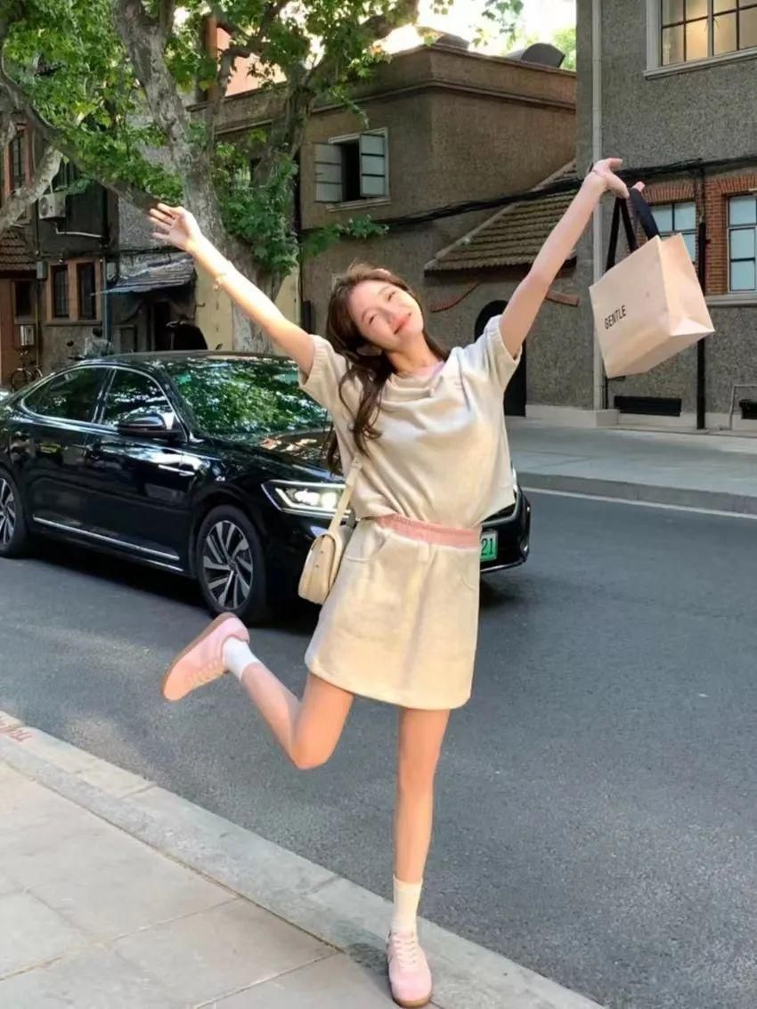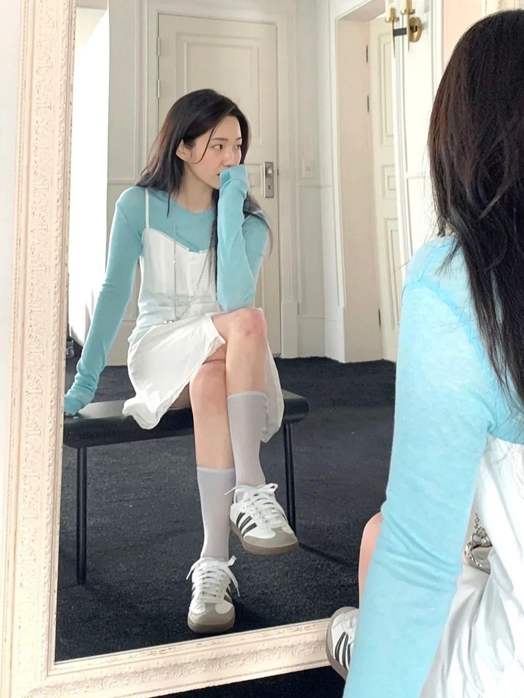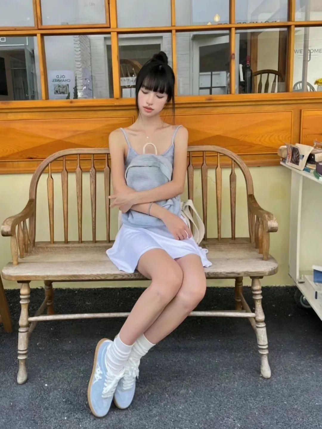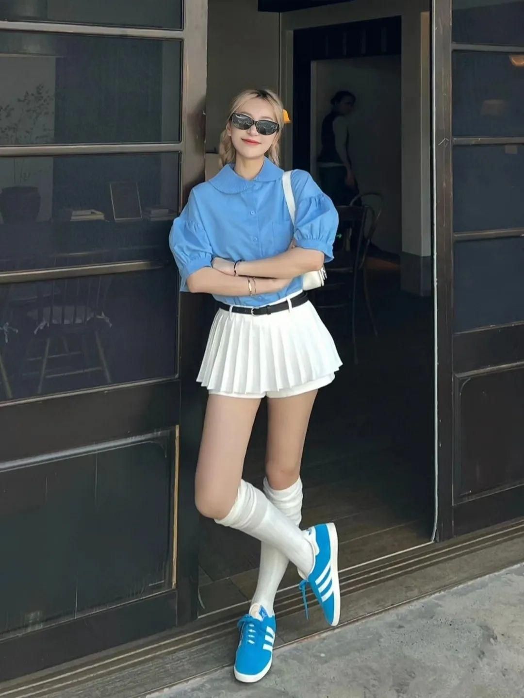 不过不同风格的半裙,也会搭出不同的味道,最基础的就是运动半裙,和芭蕾德训鞋搭配演绎运动少女风~