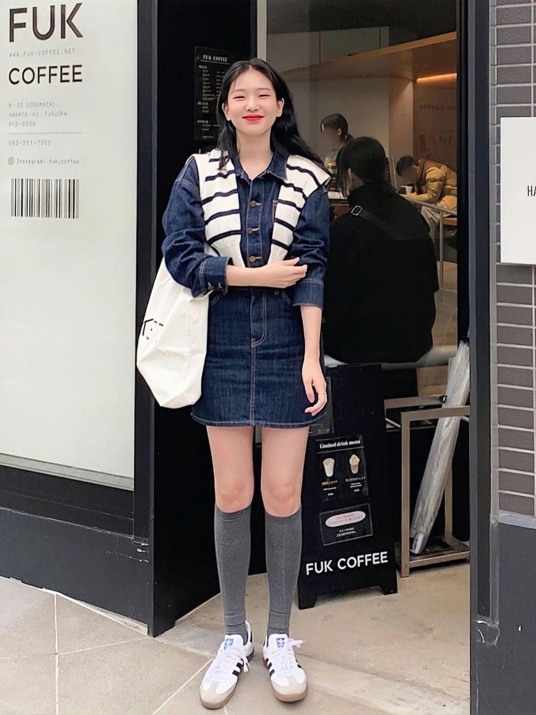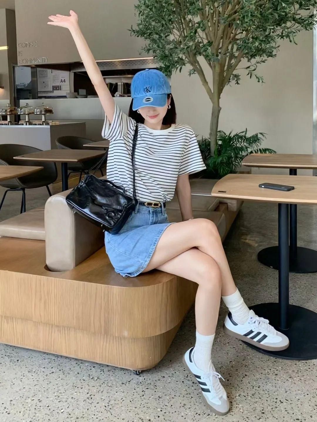 喜欢休闲风的姐妹,那就搭配牛仔半裙,看似中规中矩,但绝不出错,通勤、逛街等场合都适配。