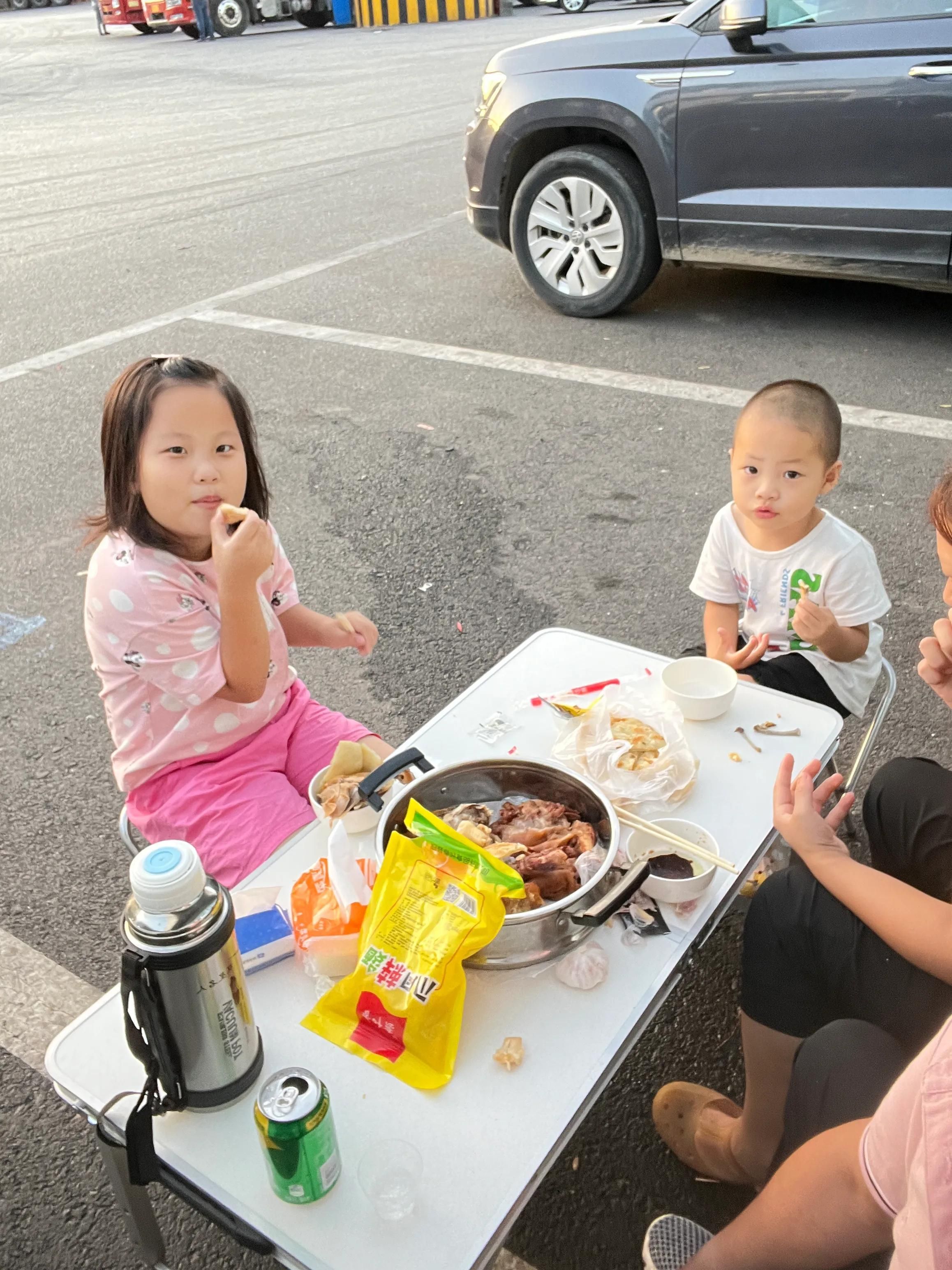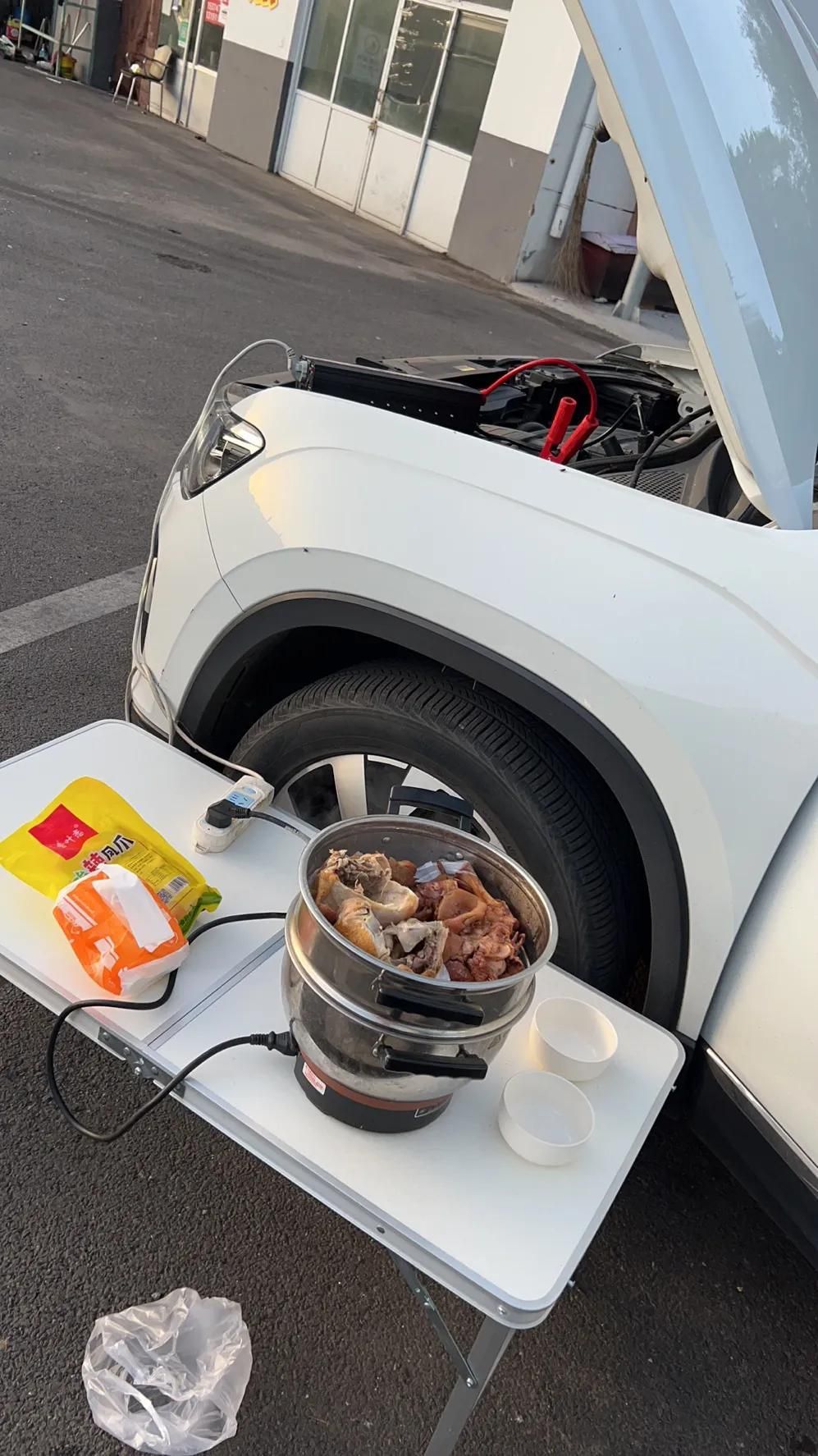 在河北下高速吃饭加油的时候,买了一个肘子带着了在服务区露营的时候热了下