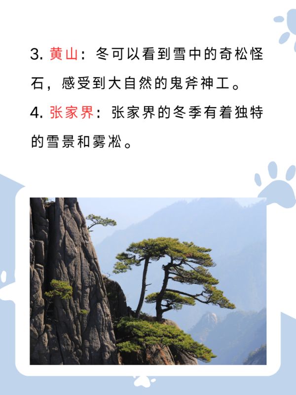 3. 黄山:冬天的黄山,银装素裹,云海飘渺。你可以看到雪中的奇松怪石,感受到大自然的鬼斧神工。