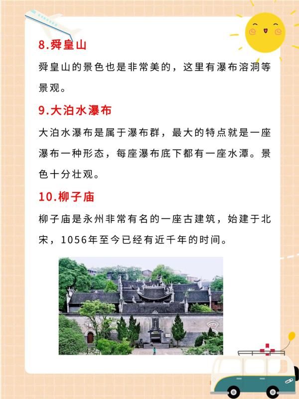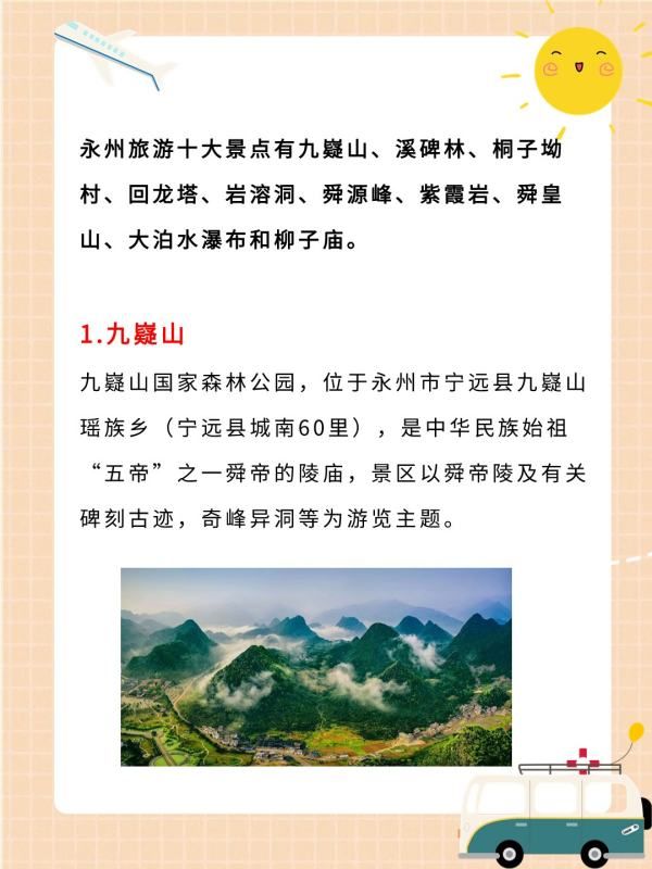 永州旅游十大景点有九嶷山、溪碑林、桐子坳村、回龙塔、岩溶洞、舜源峰、紫霞岩、舜皇山、大泊水瀑布和柳子庙。