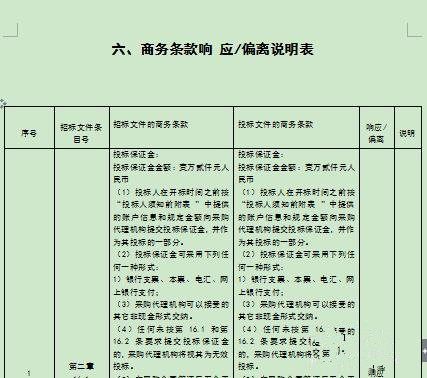 ”商务响应偏离表“是招标文件中经常提到到填充的,是商务部分的核心部分,它的格式一般在招标文件中都有模板,只能找到相对应的内容填进去就好了。一般有(响应时间、服务地点、交货期、履约保证金、、、、)有正偏离的最好用着重号标明出来,可能有助于将自己公司的优突显出来
