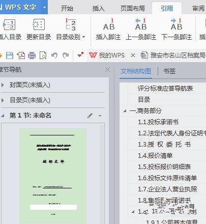 最后需要给自己编辑的投标文件添加一个目录:以便于对方查阅,点击“引用”看到左下方的“插入目录”点击一下即可
