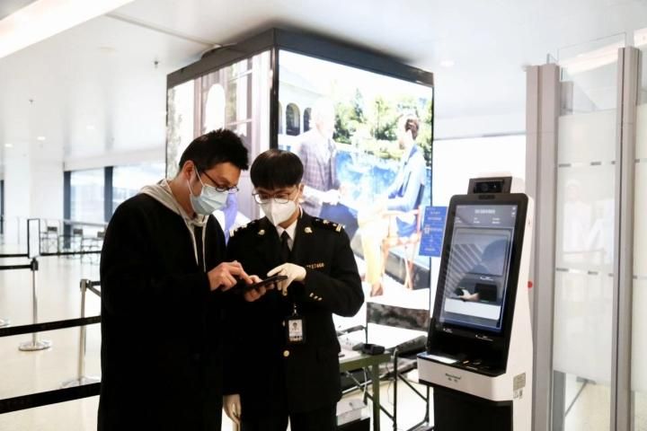 在入境通关现场,宁波机场海关新增了健康申报验核一体机。记者看到,回国旅客只需要在线使用“海关旅客指尖服务”小程序自助填写相关信息,生成通关二维码,几秒钟即可顺利通关。现场,还同步启动了托运行李先期机检功能,绝大多数进境旅客在提取行李后可直接通关,提升“无感通关”体验。