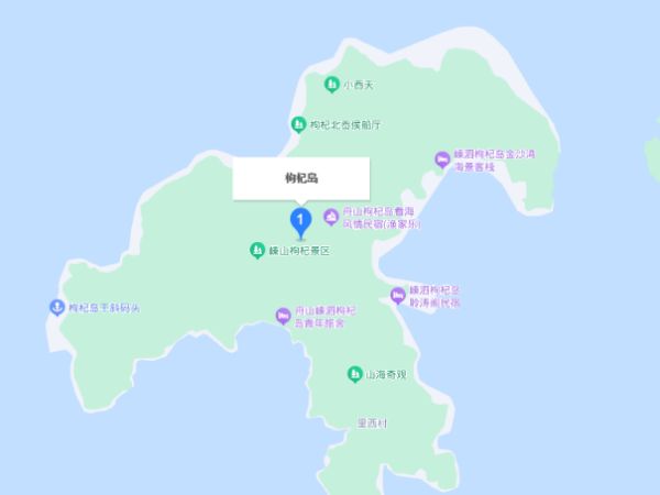 该岛略呈丁字形,以山脉为主体,山顶岩石裸露,山谷中植被丰富。该岛以枸杞灌木命名,枸杞灌木是一种中草药,在枸杞岙附近随处可见。五里石碑下沿有一条天然石凳,可供游客充分休息。
