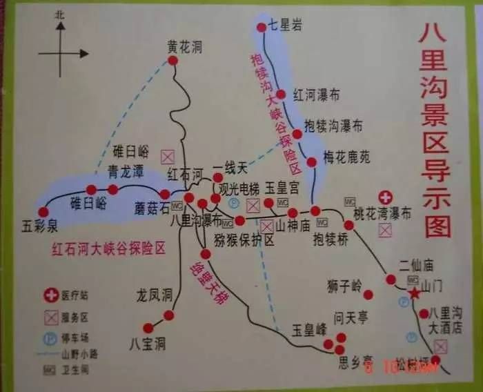 二仙桥——桃花湾瀑布——桃花潭 ——抱犊桥——将军潭瀑布——山神庙——醉仙桥——仙人迎客——老子布道——玉皇宫——羊洲地——八里沟大瀑布