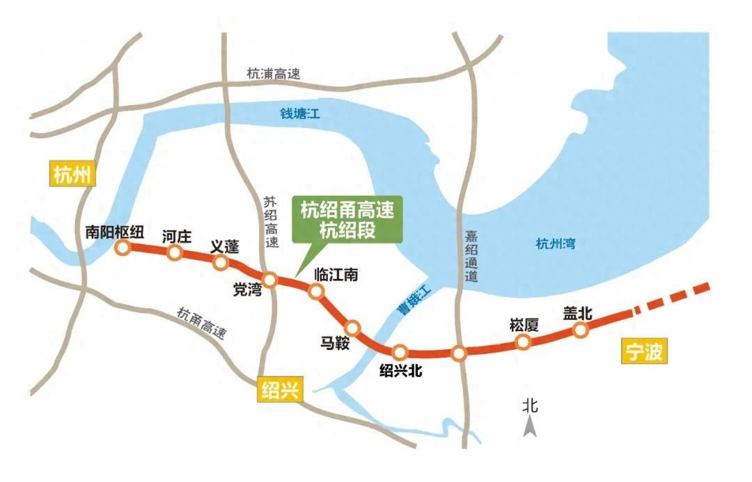 杭绍甬高速位于杭甬高速的北面,走向与杭甬高速大体平行。杭甬高速是目前唯一直接连通杭州与宁波的高速公路,车流量较大,高峰期经常出现拥堵。杭绍甬高速全线贯通后,能有效缓解杭甬高速的拥堵问题,并串联起杭州钱塘新区、绍兴滨海新区等多个新区。