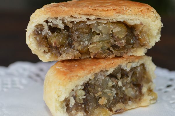 6、馅饼:选用优质面粉、猪油、上等绿豆等烘制而成,其制作重在火候,做到整个饼内熟外赤不走油,吃起来饼皮香酥油润,鲜馅冰凉清甜;