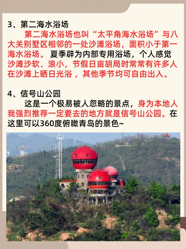 第二海水浴场也叫“太平角海水浴场”与八大关别墅区相邻的一处沙滩浴场,面积小于第一海水浴场。 夏季辟为内部专用浴场,个人感觉 沙滩沙软、浪小,节假日亩胡局时常常有许多人在沙滩上晒日光浴 ,其他季节均可自由出入。