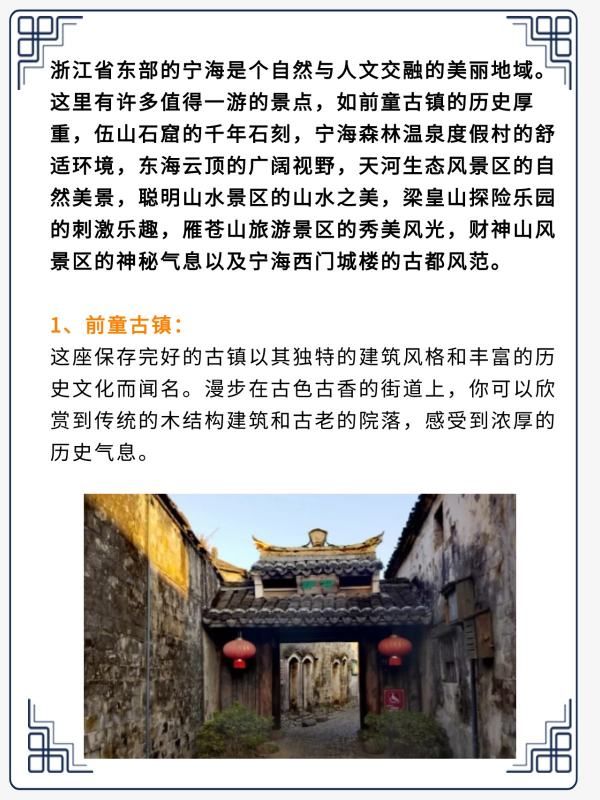 浙江省东部的宁海是个自然与人文交融的美丽地域。这里有许多值得一游的景点,如前童古镇的历史厚重,伍山石窟的千年石刻,宁海森林温泉度假村的舒适环境,东海云顶的广阔视野,天河生态风景区的自然美景,聪明山水景区的山水之美,梁皇山探险乐园的刺激乐趣,雁苍山旅游景区的秀美风光,财神山风景区的神秘气息以及宁海西门城楼的古都风范。