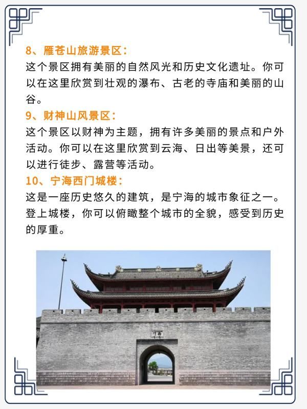 这是一座历史悠久的建筑,是宁海的城市象征之一。登上城楼,你可以俯瞰整个城市的全貌,感受到历史的厚重。