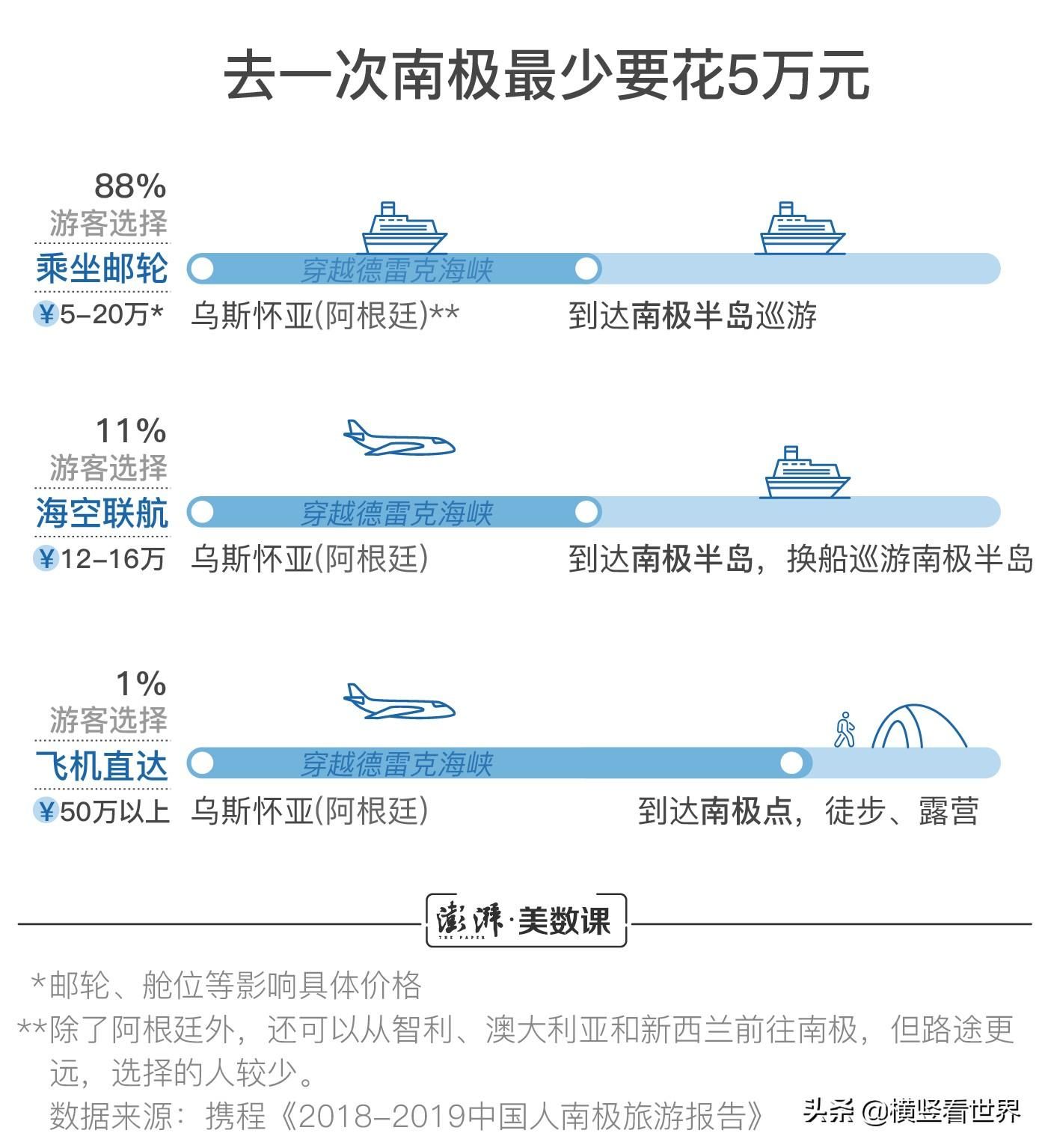 目前,每年暖季去南极旅游的人次已超过五万,但要去玩一趟并不容易,因为它真的不便宜。而报价之所以从5万元到50万元不等,差异主要在交通工具。南极游的费用主要由机票、船票和住宿这三块构成,其中前两者是大头。