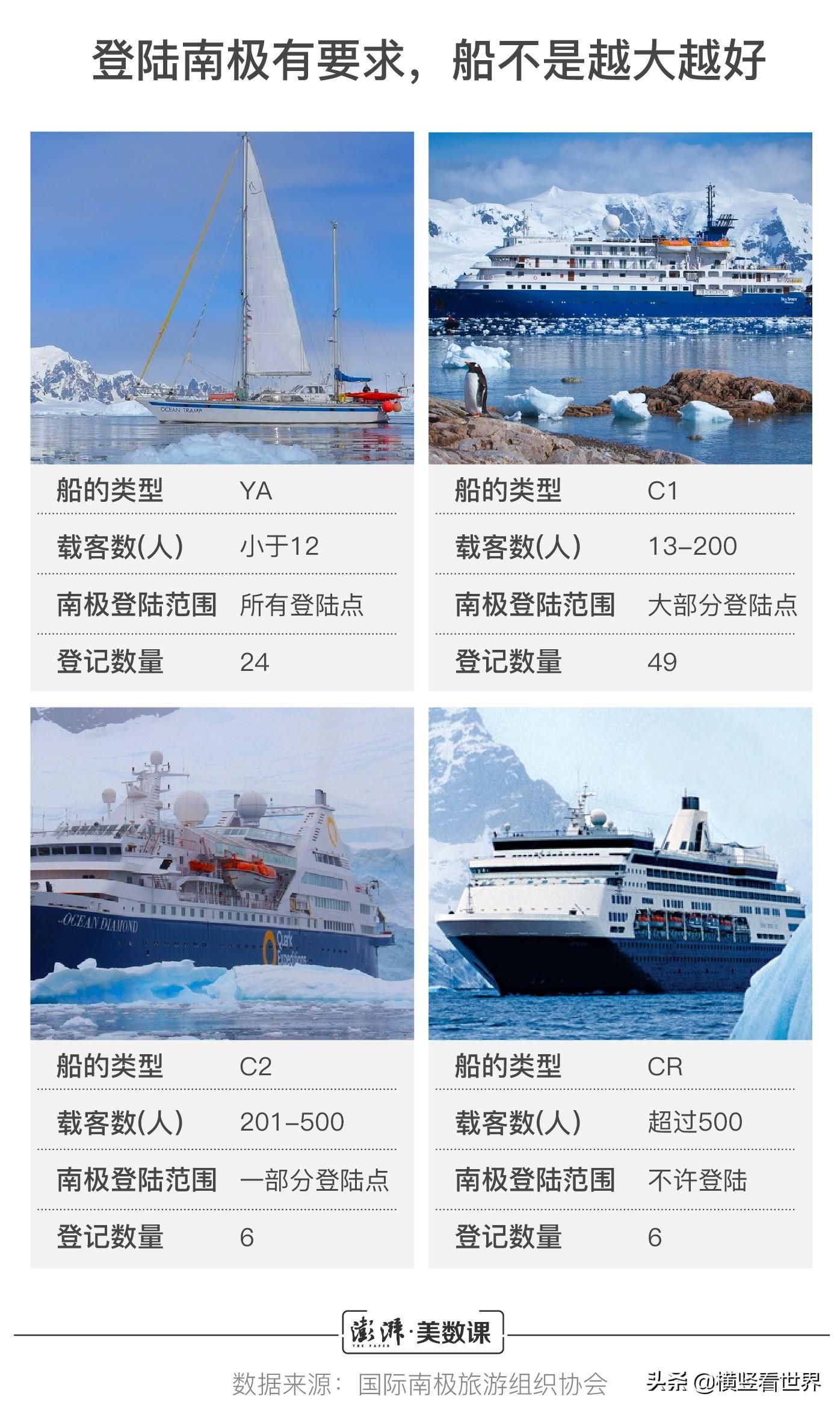另外,即便是花了大价钱,你可能也没法在南极大陆踩上一脚。因为并不是所有的船只都能在南极靠岸。根据IAATO规定,南极每个登陆点一次仅允许不超过100人登陆,且每天只允许两艘船停靠。载客200人的C1级邮轮每天能登陆2次,而能载客500人的C2级邮轮每天只有1次机会,至于载客数超过500人的CR级邮轮,则被禁止靠岸。