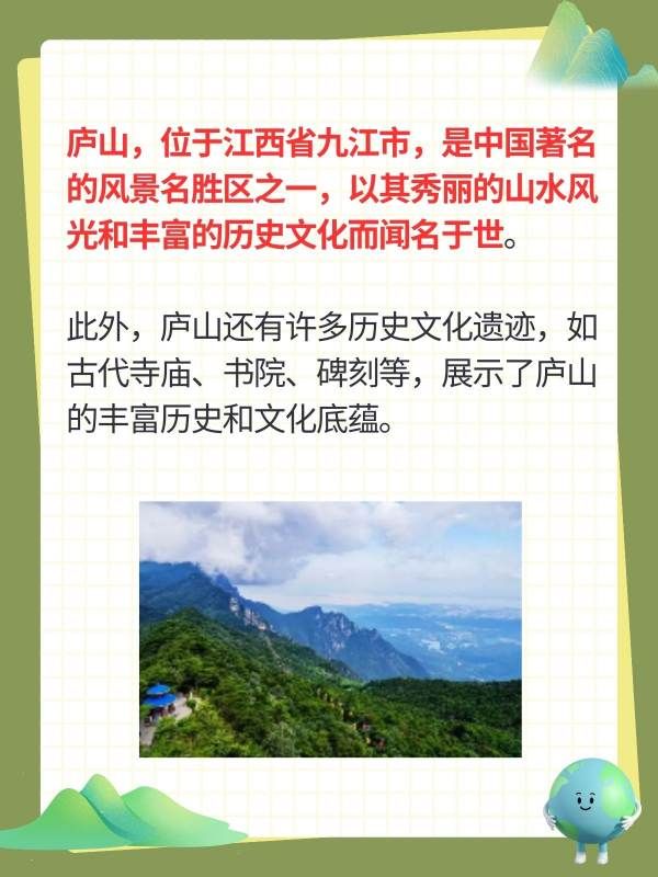 庐山,位于江西省九江市,是中国著名的风景名胜区之一,以其秀丽的山水风光和丰富的历史文化而闻名于世。