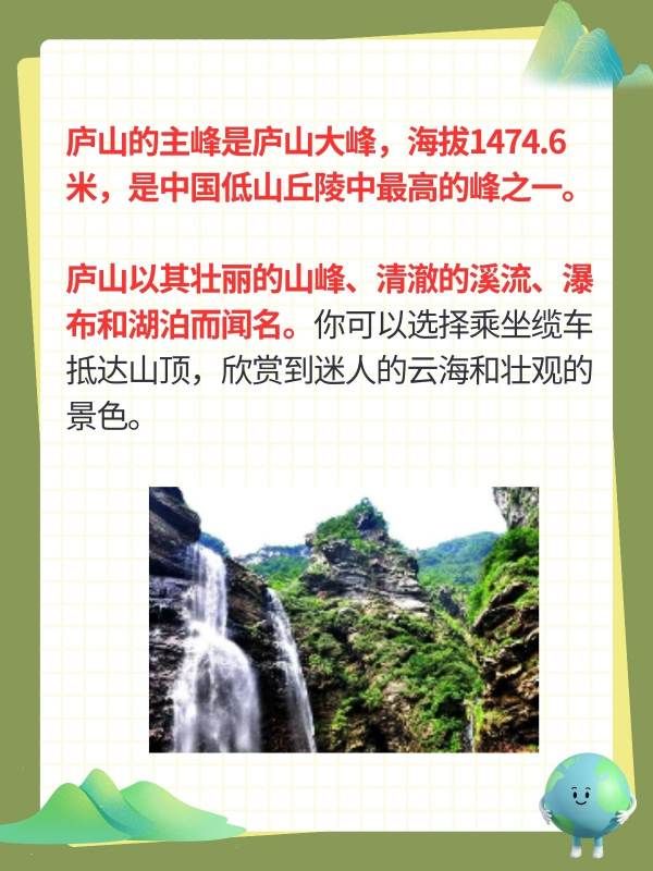 庐山的主峰是庐山大峰,海拔1474.6米,是中国低山丘陵中最高的峰之一。庐山以其壮丽的山峰、清澈的溪流、瀑布和湖泊而闻名。