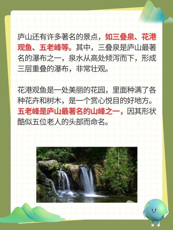 庐山还有许多著名的景点,如三叠泉、花港观鱼、五老峰等。其中,三叠泉是庐山最著名的瀑布之一,泉水从高处倾泻而下,形成三层重叠的瀑布,非常壮观。花港观鱼是一处美丽的花园,里面种满了各种花卉和树木,是一个赏心悦目的好地方。五老峰是庐山最著名的山峰之一,因其形状酷似五位老人的头部而命名。