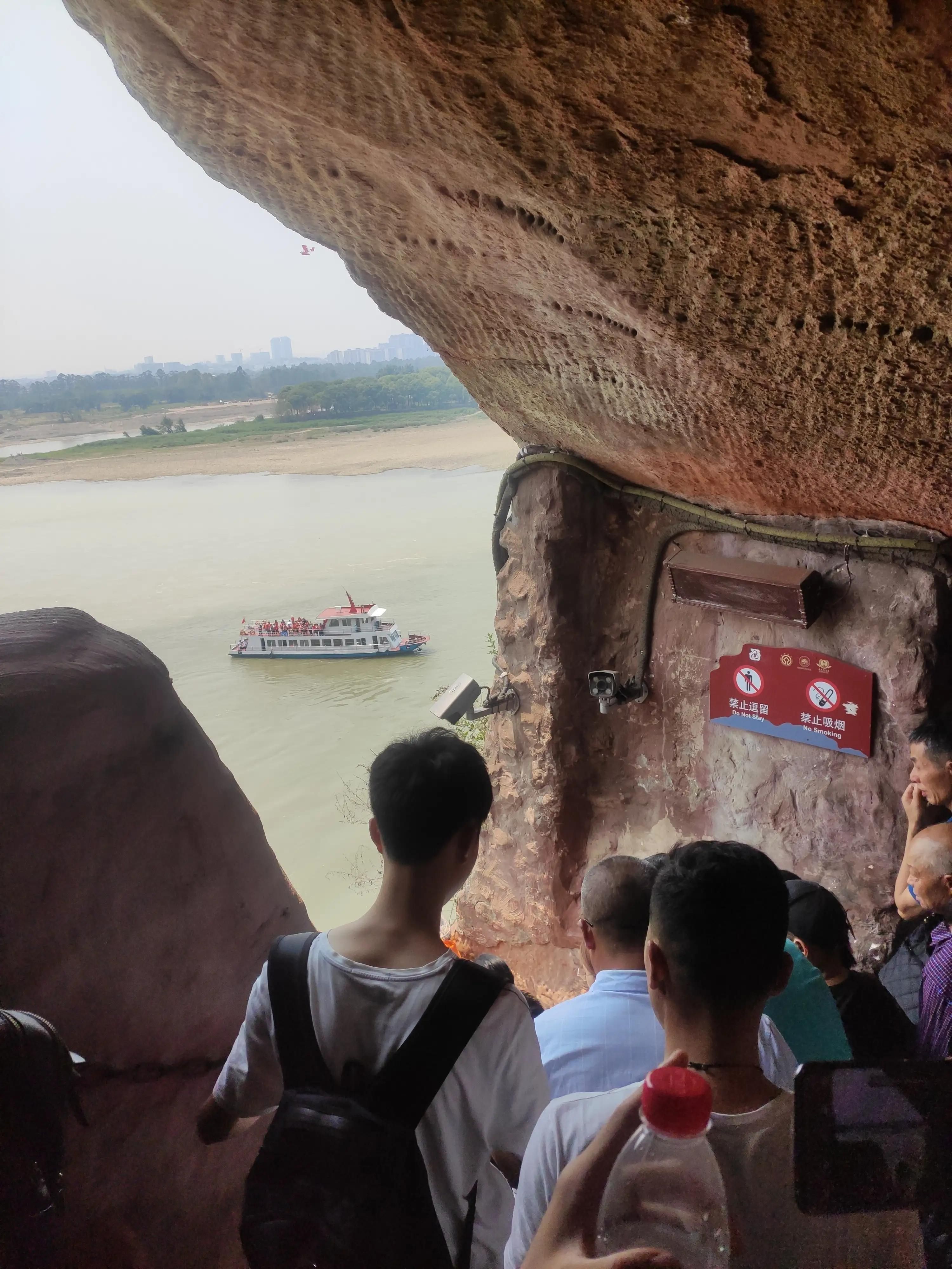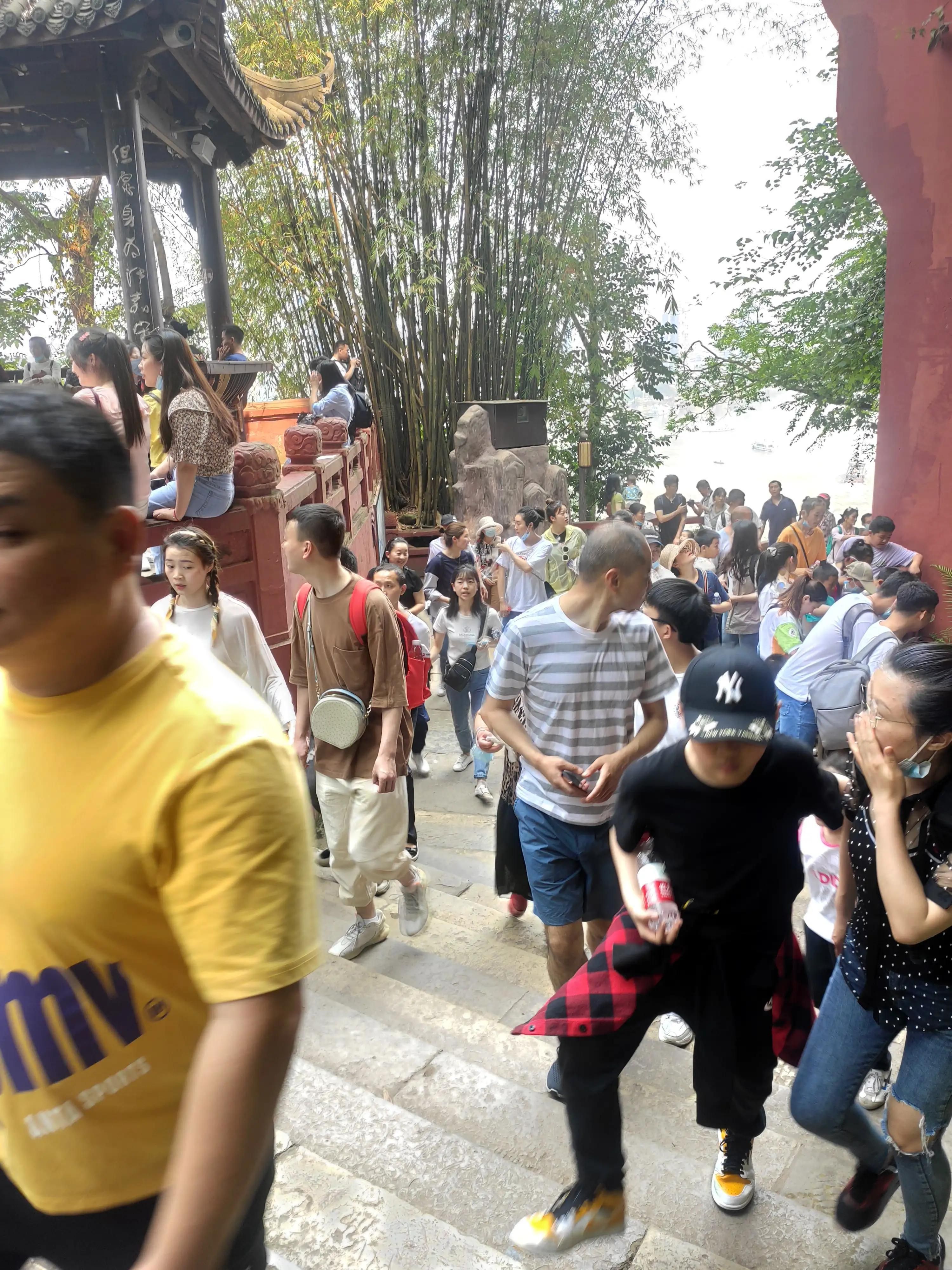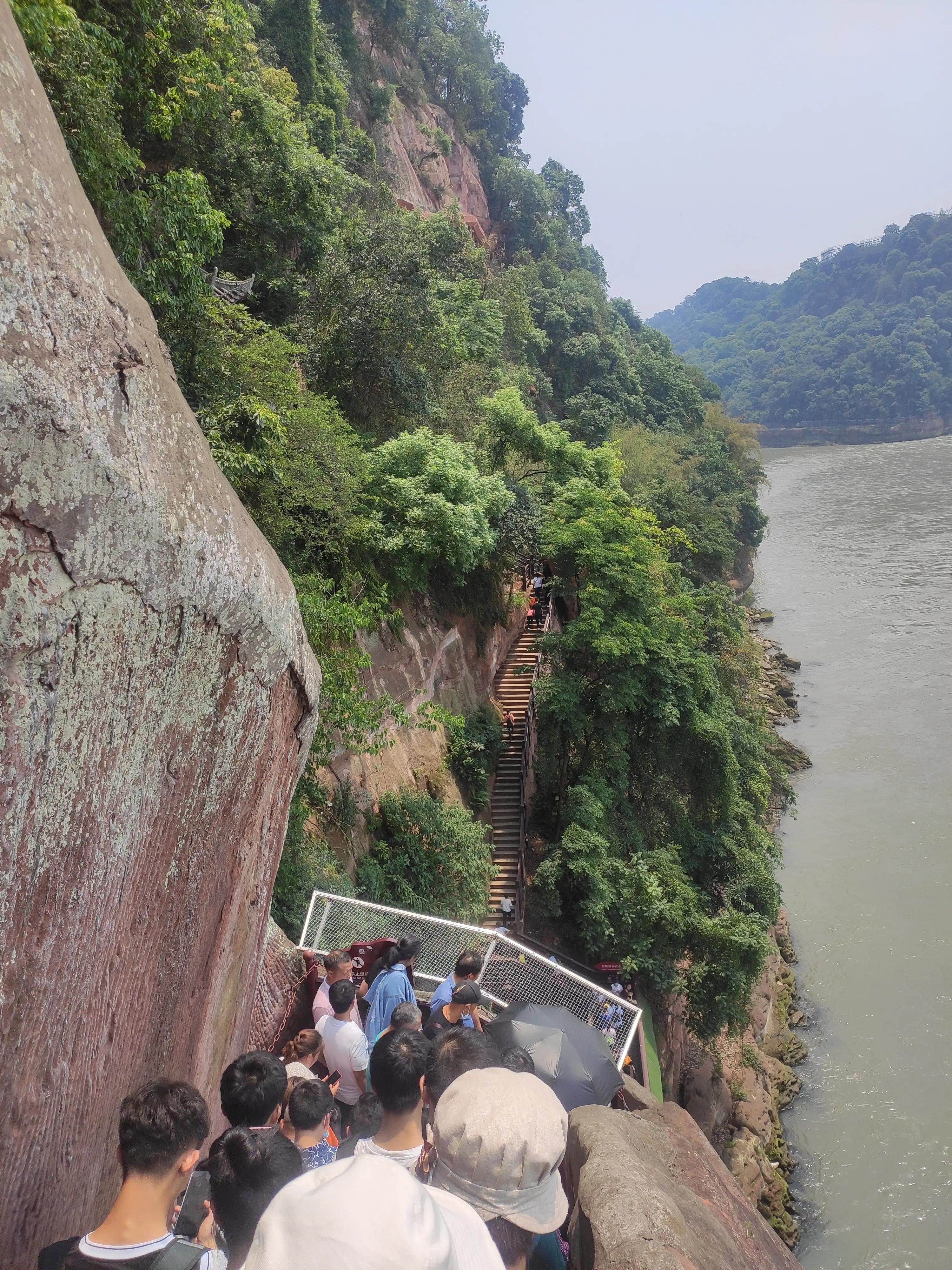 扛过了三次排队,进入大佛右边的九曲栈道。栈道仅约一米宽,依崖凿就,越维往下越陡,简直就是悬在空中。如果从护拦边伸头一望,足下大江波涛滚滚,定叫你头晕目眩,胆颤心惊。游客们都得小心翼翼,不敢疏忽。
