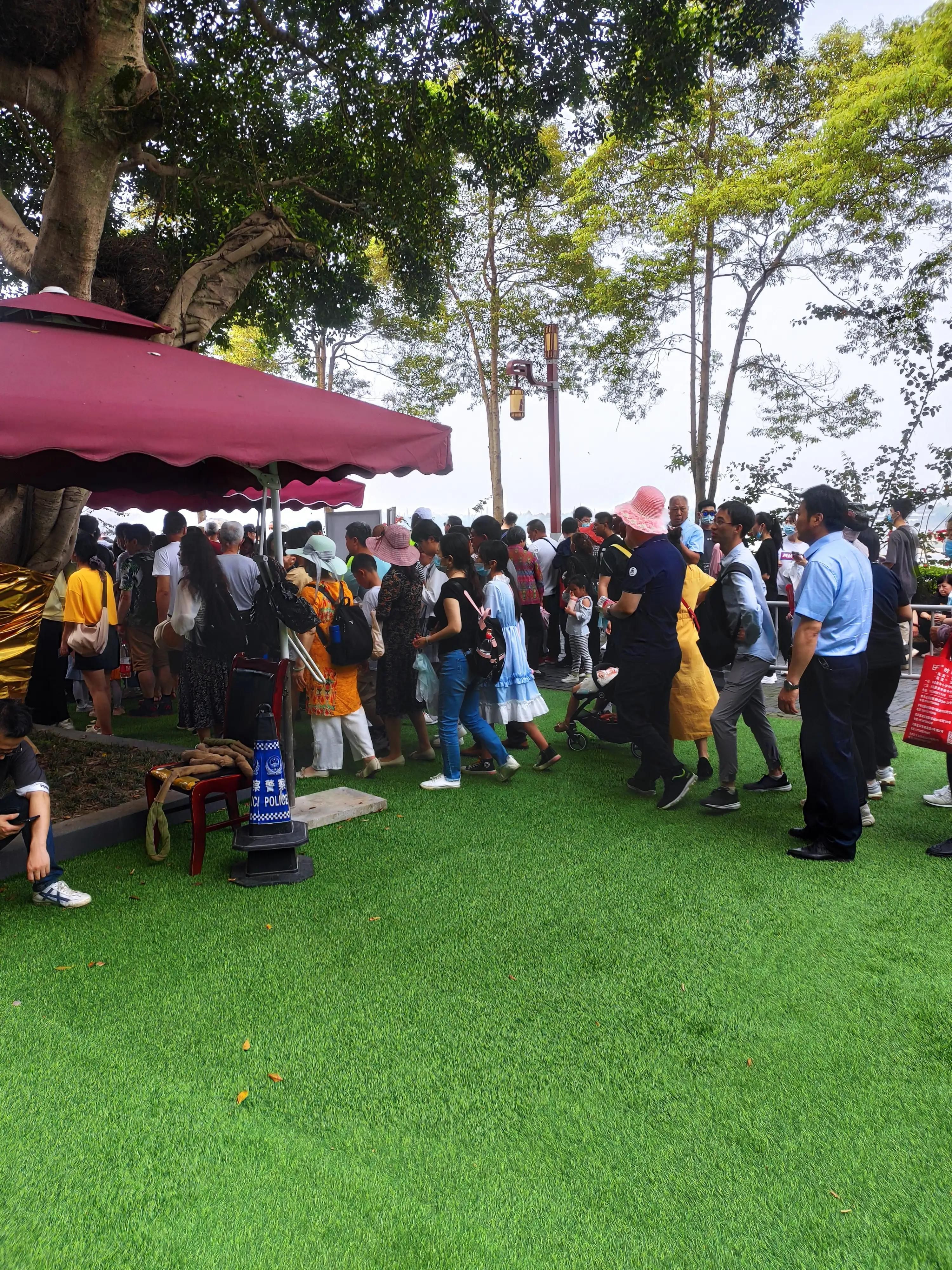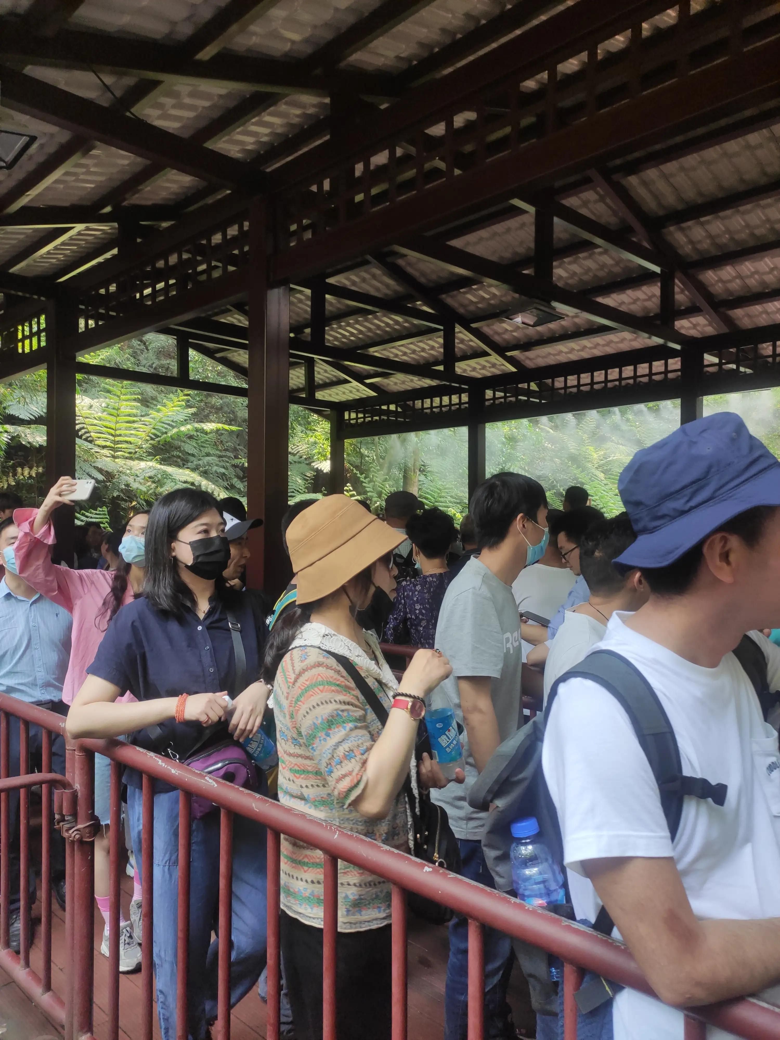 早上八点,我们就进入公园广场,直到下午四时左右才得以返回。其间三次排队,每次都足有两小时。虽还不是盛夏,但烈日炎炎,气温已高达30多度。成百上千的游客,接蹱摩肩,挨挨挤挤,全都带着口罩,等,等,等。等得好心烦哟!没有健康的身体,没有顽强的意志力,你是根本扛不住的。中途放弃比行的为数不少呢。