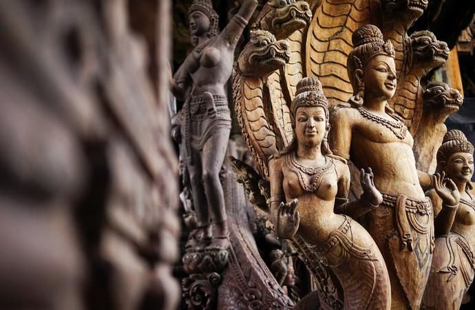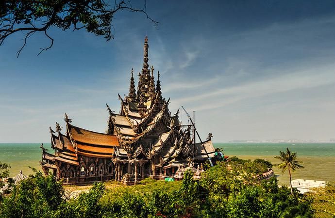真理寺由纯红木和柚木建造而成,设计风格以亚洲传统艺术风格和泰国曼谷王朝的华美风格为主。寺内木雕艺术堪称一绝,展现了鬼斧神工一般的木雕技艺,且寺内还有许多高僧的舍利子供人瞻仰。