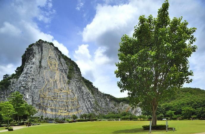 七珍佛山是为了庆祝泰皇登基50周年纪念,先剖开一面山,削平山面,就着山形用镭射画出打坐的佛像,随后用意大利进口18吨重的24K黄金镶嵌线条,金线耀眼,而且据说佛像的心脏出藏有释迦牟尼的舍利。