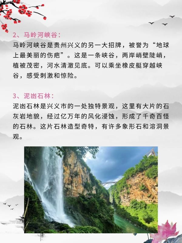 马岭河峡谷:马岭河峡谷是一处以河流侵蚀形成的深切峡谷,两岸山峰陡峭,河水清澈,沿途有许多瀑布和深潭,是徒步和探险的好去处。