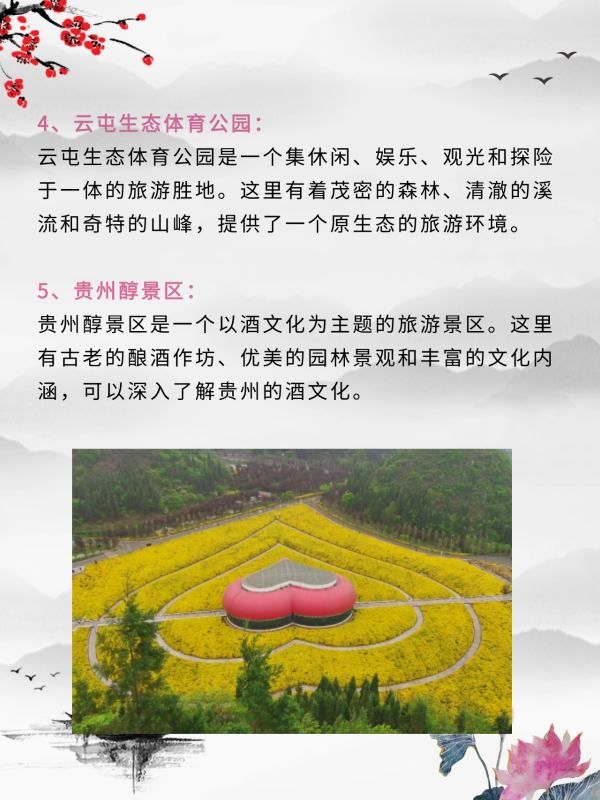 贵州醇景区:这是一个集酒文化体验、生态旅游和休闲度假为一体的旅游景区。游客可以参观酒厂,了解酿酒工艺,品尝当地的特色白酒。