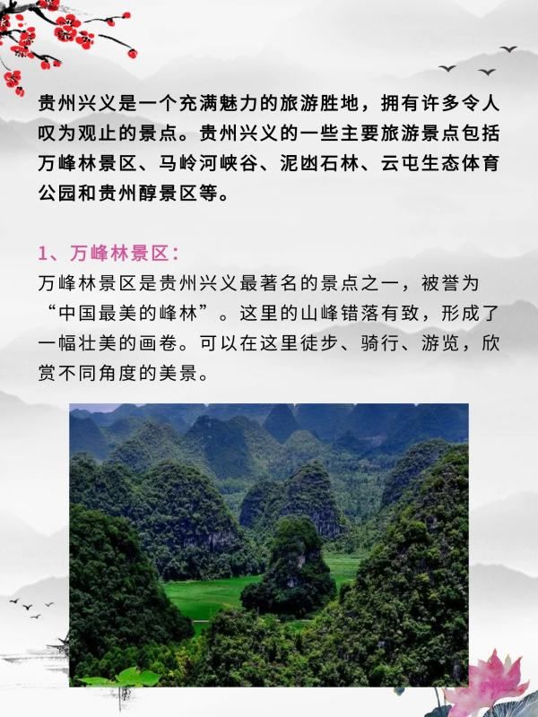 贵州兴义是一个充满魅力的旅游胜地,拥有许多令人叹为观止的景点。贵州兴义的一些主要旅游景点包括万峰林景区、马岭河峡谷、泥凼石林、云屯生态体育公园和贵州醇景区等。