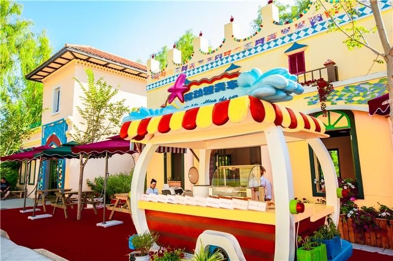 检票完毕,我们走进园区,首先看到的就是用花装扮的水池和园区指示牌,放眼望去,园区里到处是花草,特别优美。根据指示牌,我们来到了商业街。整条街上欧式风格的装扮,让我仿佛置身于异国。各式各样的小吃店、民族味道的餐饮店遍布其中,本来还在发愁午饭怎么解决,现在不用担心了。