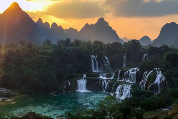 德天瀑布为典型的岩溶瀑布,宽100米,垂直高度70多米,一波三折,形成三级瀑布,是亚洲第一、世界第四大跨国瀑布,年均水流量约为贵州黄果树瀑布的三倍。